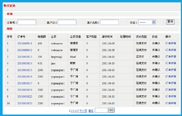 根據(jù)訂購(gòu)日期和圖片名稱可進(jìn)行查詢,顯示用戶訂購(gòu)的RM圖片具體信息,可查看訂購(gòu)會(huì)員的具體資 料,無(wú)論是否具有該尺寸的圖片,支持郵件信息反饋賣家身份審核:根據(jù)用戶名,姓名,審核狀態(tài)來(lái)查詢相應(yīng)用戶,可查看賣家提交的詳細(xì)信息來(lái)審核用戶是否具有賣家的資格。