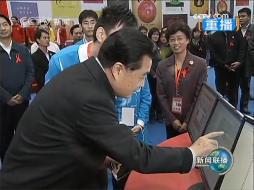 11月30日上午,在第22個(gè)世界艾滋病日到來之際,胡錦濤總書記和中共中央政治局常委、國(guó)務(wù)院副總理李克強(qiáng)來到國(guó)家會(huì)議中心,參加首都防治艾滋病志愿者活動(dòng)。胡錦濤代表黨中央,向?yàn)榉乐伟滩∽鞒鲐暙I(xiàn)的廣大醫(yī)療衛(wèi)生工作者和志愿者表示誠(chéng)摯的問候。