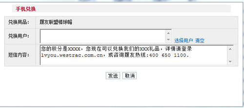 上傳的新積分商品,管理員可以給用戶手機發(fā)送兌換商品的通知,選擇發(fā)送的用戶,短信內(nèi)容為系統(tǒng)自動提取,其內(nèi)容可以再次修改。