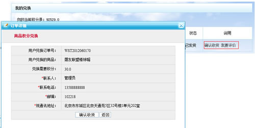 商品收貨:兌換訂單發(fā)完貨后,由會員確認收貨,會員確認收貨后即此訂單交易完成。在一定時期內(nèi)如會員未做收貨確認,管理員可修改收貨狀態(tài),完成訂單交易。