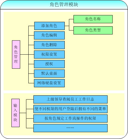 通過(guò)角色用戶的創(chuàng)建和管理,并與部門管理和人員管理配合使用形成一個(gè)分部門的管理體系。如部門的相關(guān)領(lǐng)導(dǎo)可以查閱部門中員工的工作日志,可以使不同部門、不同權(quán)限的用戶登陸后擁有不同的菜單和界面,由角色和級(jí)別來(lái)規(guī)定工作流操作的權(quán)限等。