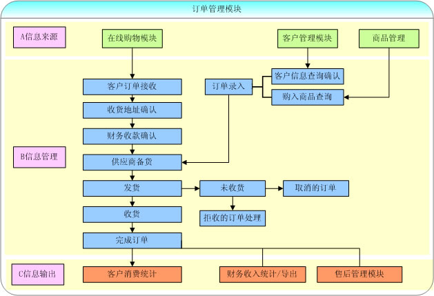 該模塊可以接收電子商務(wù)平臺(tái)上會(huì)員購買商品時(shí)下的訂單,也可以在用戶打電話等非網(wǎng)站下單的情況下管理人員幫用戶下單,下單時(shí)可以查詢驗(yàn)證用戶信息,并查詢選擇所要購入的商品,下單后經(jīng)收收貨地址確認(rèn)、財(cái)務(wù)收款確認(rèn)、供貨商備貨、物流發(fā)貨、收貨完成、拒收貨處理、取消訂單等環(huán)節(jié)的管理完成訂單處理的全過程,其中為了方便訂單的全程監(jiān)控,設(shè)置了訂單監(jiān)控功能,為對訂單的誤操作后的恢復(fù)設(shè)置了訂單回滾功能。處理后的訂單相關(guān)數(shù)據(jù)歸檔到客戶關(guān)系管理的客戶消費(fèi)統(tǒng)計(jì)、及財(cái)務(wù)數(shù)據(jù)導(dǎo)出模塊的財(cái)務(wù)統(tǒng)計(jì)中。