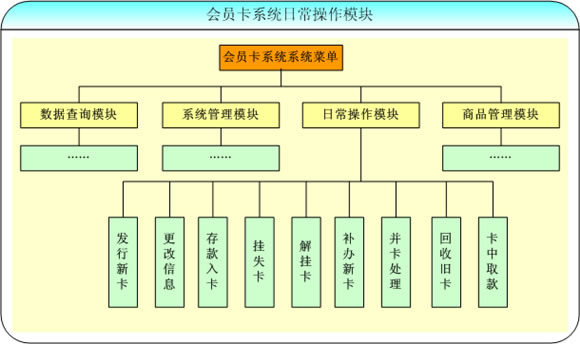 會員卡系統(tǒng)中的日常操作模塊主要完成針對卡的各種操作,分為發(fā)行新卡、更改信息、存款入卡、掛失卡、解掛卡等多個部分,是會員卡管理系統(tǒng)中一個重要的組成部分。