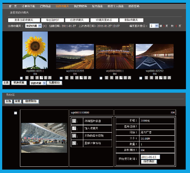選擇滿意的圖片可以放進(jìn)購(gòu)物車中,可以查看圖片信息、移除圖片、收藏圖片和計(jì)算圖片價(jià)格,在購(gòu)物車中可以針對(duì)其中的圖片進(jìn)行結(jié)賬。