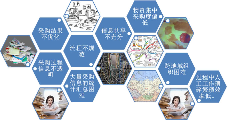 集團(tuán)采購工作瓶頸:采購過程信息不透明、流程不規(guī)范、購結(jié)果不優(yōu)化、信息共享不充分、物資集中采購度偏低、跨地域組織困難、大量采購信息的統(tǒng)計(jì)匯總困難、過程中人工工作瑣碎繁瑣效率低。