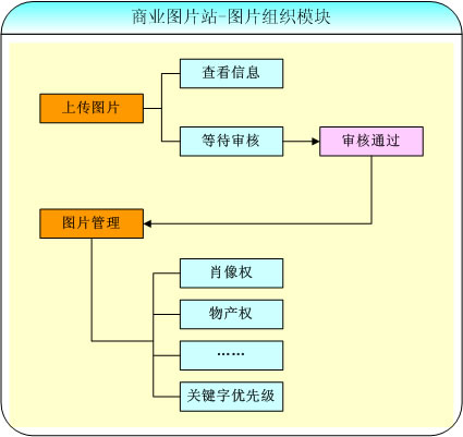 商業(yè)圖片站-圖片組織模塊主要是用戶(hù)用來(lái)上傳圖片,查看上傳圖片信息(圖片審核通過(guò)前);在上傳圖片審核通過(guò)后用戶(hù)可以對(duì)圖片進(jìn)行管理,如輸入關(guān)鍵字級(jí)別、肖像權(quán)、物產(chǎn)權(quán)、授權(quán)類(lèi)型、圖片價(jià)格等信息,通過(guò)圖片名稱(chēng)查找相關(guān)圖片等操作。