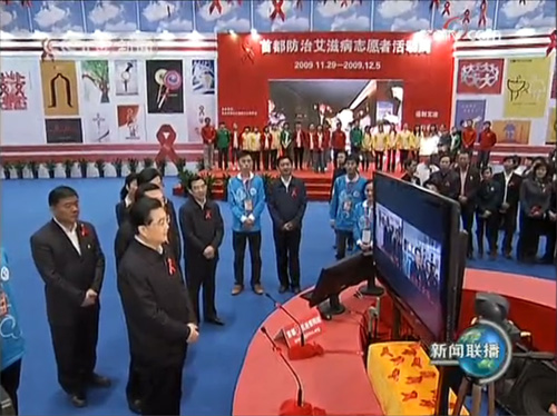 11月30日上午,在第22個(gè)世界艾滋病日到來之際,胡錦濤總書記和中共中央政治局常委、國(guó)務(wù)院副總理李克強(qiáng)來到國(guó)家會(huì)議中心,參加首都防治艾滋病志愿者活動(dòng)。胡錦濤代表黨中央,向?yàn)榉乐伟滩∽鞒鲐暙I(xiàn)的廣大醫(yī)療衛(wèi)生工作者和志愿者表示誠(chéng)摯的問候。