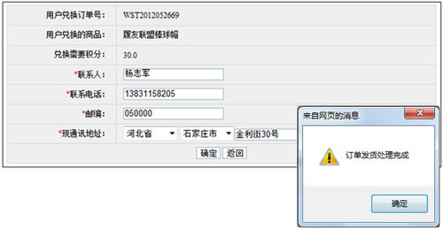 如會員想要兌換此商品,點擊“立即兌換”,進入兌換頁面,該頁面顯示出兌換的商品及所需積分,并需要會員確認送貨信息。點擊“提交”即完成兌換,并生成兌換訂單。