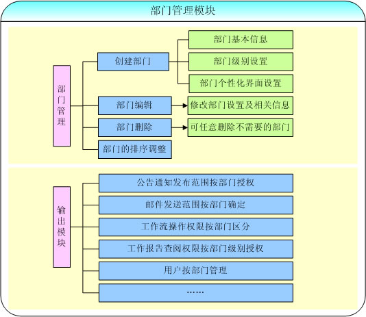 通過部門的創(chuàng)建與管理,形成分部門授權(quán)體系,比如在公告通知管理中可以按部門分配查看公告的權(quán)限;在全體人員列表中可以按部門列出人員,方便查找與交流;在工作流中可以按部門進(jìn)行流程的定義和權(quán)限分配;在工作日志的上報(bào)中,員工的工作日志可以按部級(jí)別提交給相關(guān)領(lǐng)導(dǎo)查閱、發(fā)送內(nèi)部郵件時(shí)可以按部門范圍進(jìn)行群發(fā),用戶按部門管理,等等。